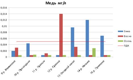 Рисунок 8 - Медь по данным лабораторных анализов (ПДК для водоема высшей категории 0,005 мг/л)