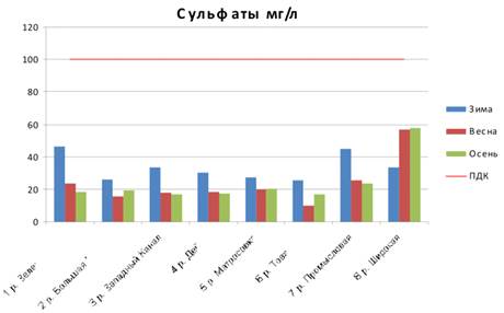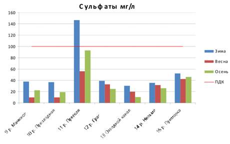 Содержание сульфатов во всех водотоках, за исключением реки Преголи, в 2 раза и ниже значений ПДК для водотоков, установленной для водотоков высшей, первой и второй рыбохозяйственных категорий в 100 мг/